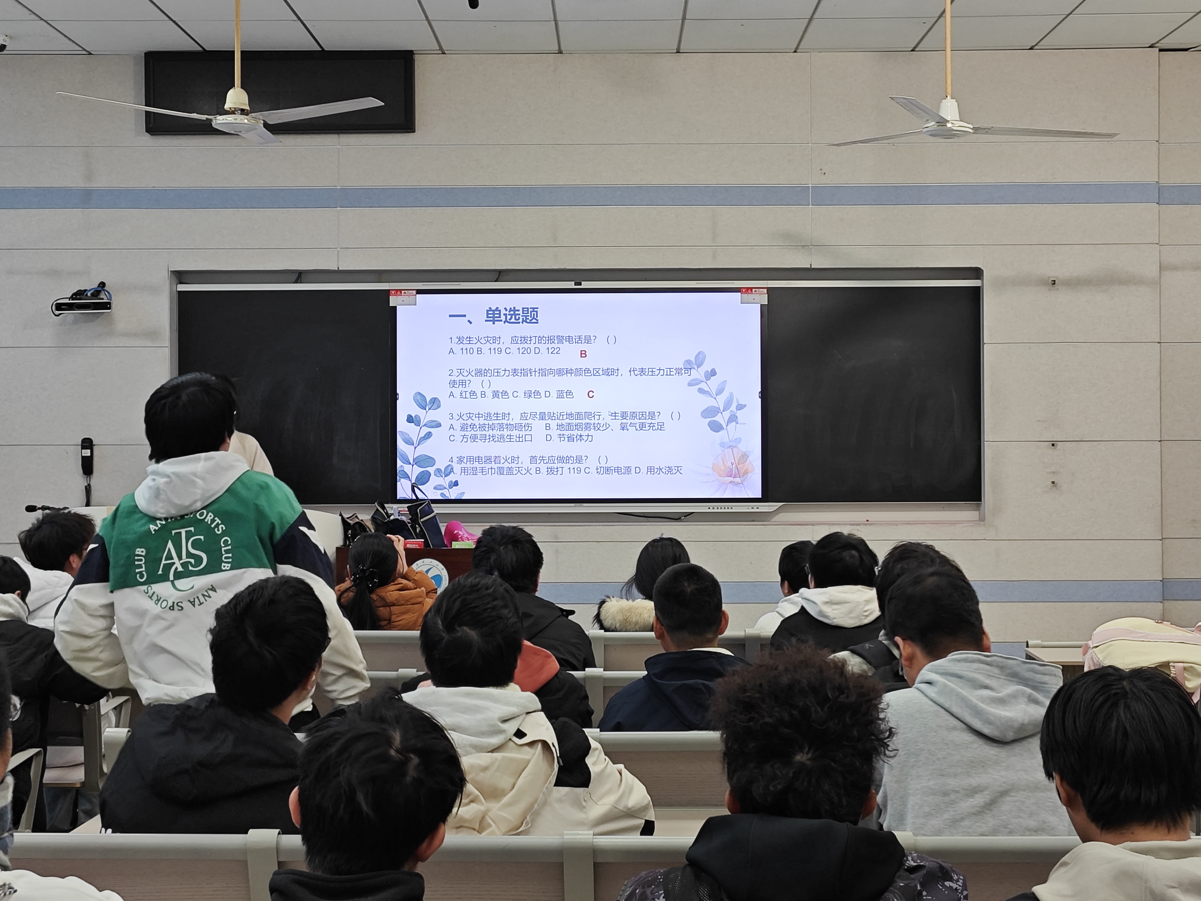 活动聚焦校园与生活中的高频火灾隐患,团支书姚艺佳结合寝室违规使用大功率电器、电动自行车“飞线充电”等真实案例,采用“案例还原+知识点提问”的方式,引导同学们思考“寝室允许使用的最大功率”“电动自行车规范充电时长”及“火灾初期逃生要点”等关键问题。同学们踊跃作答,现场气氛热烈。针对答题中出现的认知误区,姚艺佳及时厘清,并系统讲解了正确报警、初期火灾扑救及自救逃生的核心技巧,为大家筑牢了安全防线。