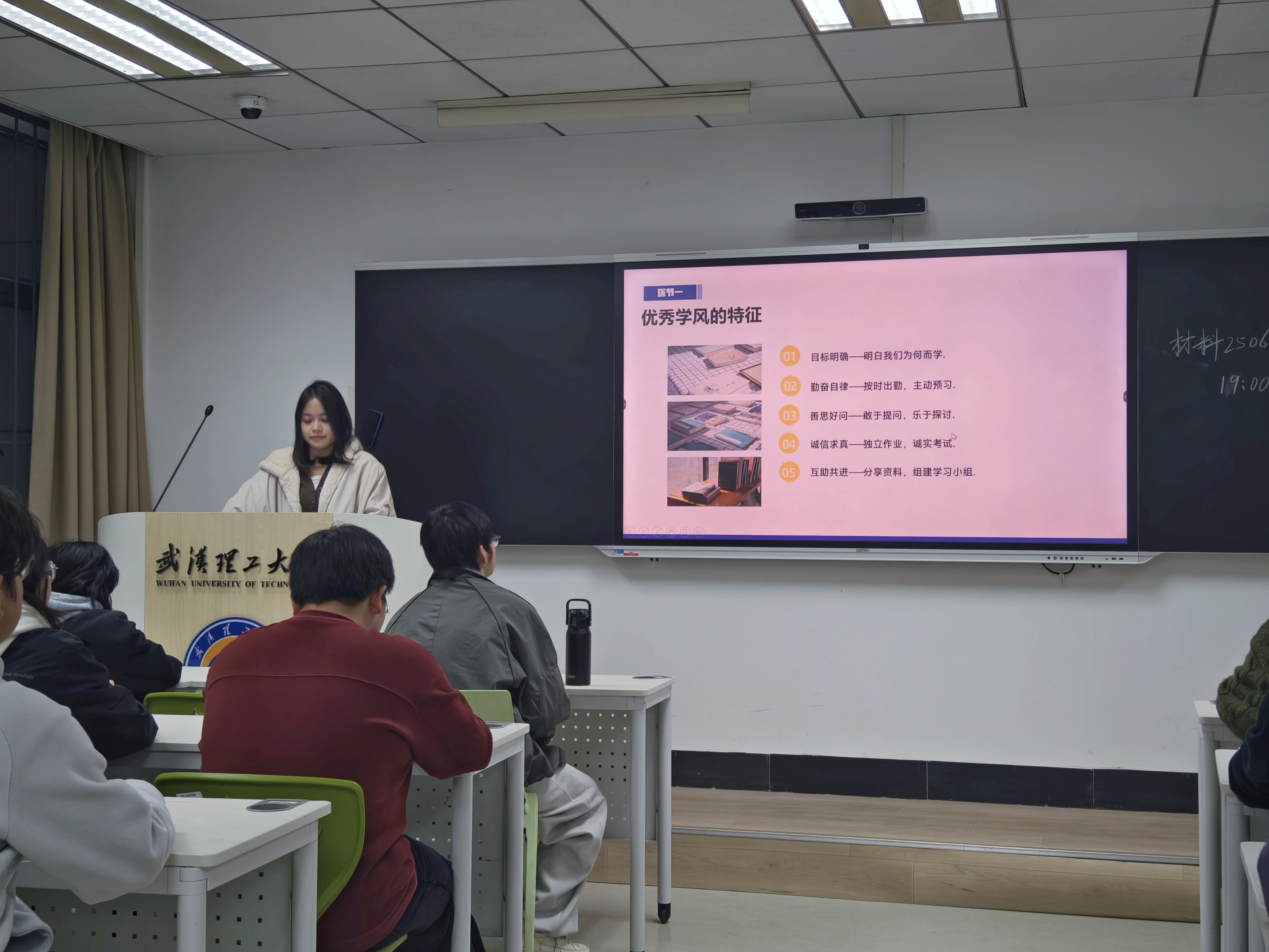 班会伊始,主持人在介绍优秀学风特征的基础上,从个人与班级两个层面强调了学风建设的重要性。她指出,学风是班级的灵魂,是全体成员思想品质与精神风貌的体现,并倡议大家将主要精力投入知识学习与个人全面发展,争做良好学风的践行者与引领者。