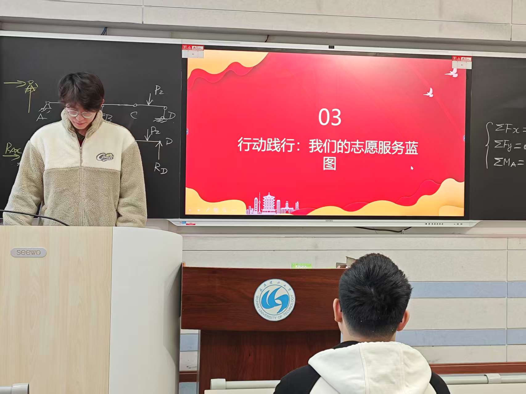 活动伊始,团支书姚艺佳同学向全体同学介绍了志愿服务对于国家、社会、人民三个方面的非凡意义,随后又阐述了“奉献、友爱、互助、进步”的志愿精神,点明了志愿服务的重要性。