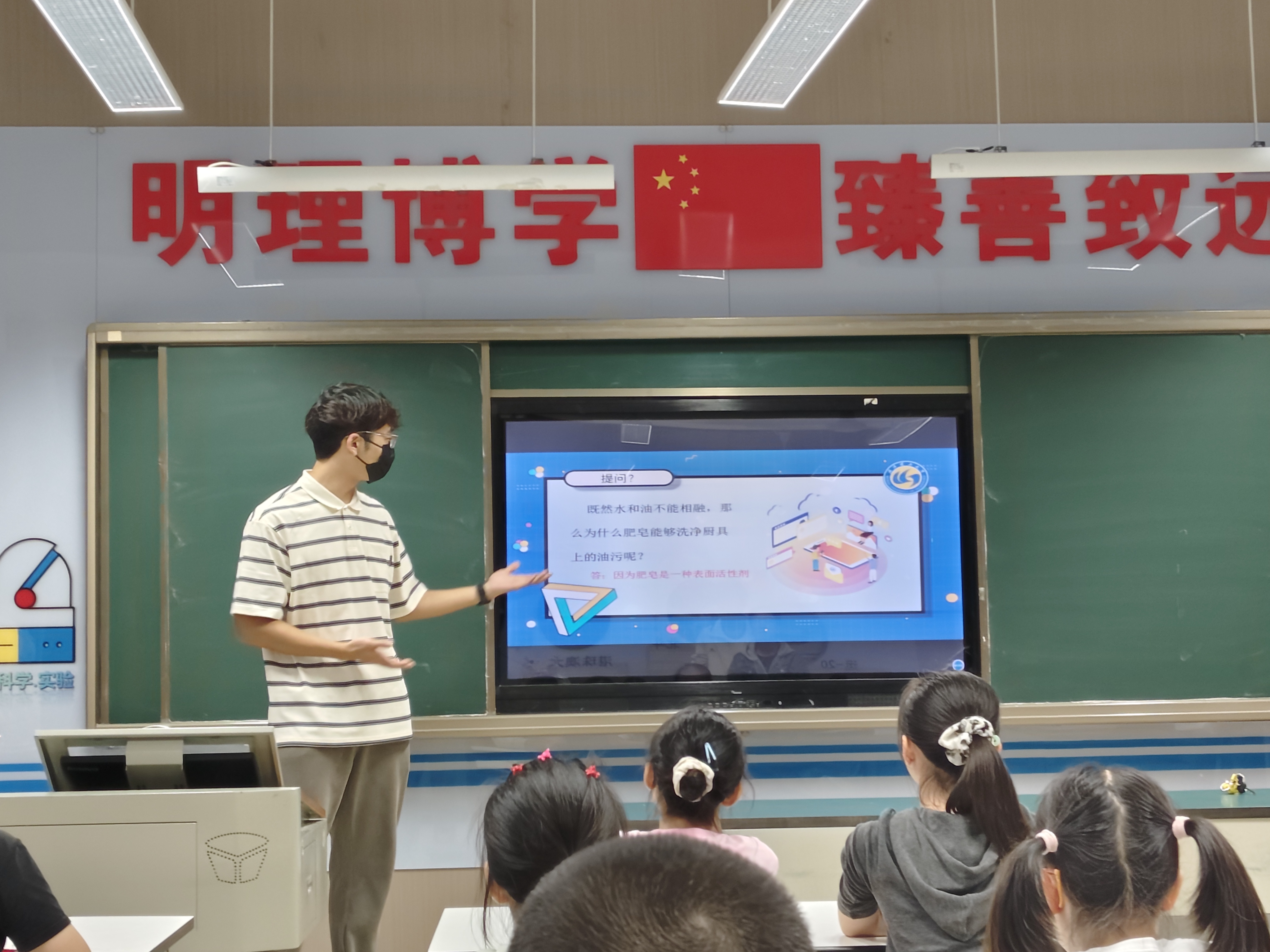 活动伊始,主讲老师翟彦峰以生活中的常见液体为切入点,迅速激发了孩子们的思考兴趣。他生动形象地向同学们展示了表面活性剂在生活中的应用,让孩子们更深入地了解到表面活性剂的用途,同时,孩子们积极回答老师提出的问题,整个氛围轻松愉悦。