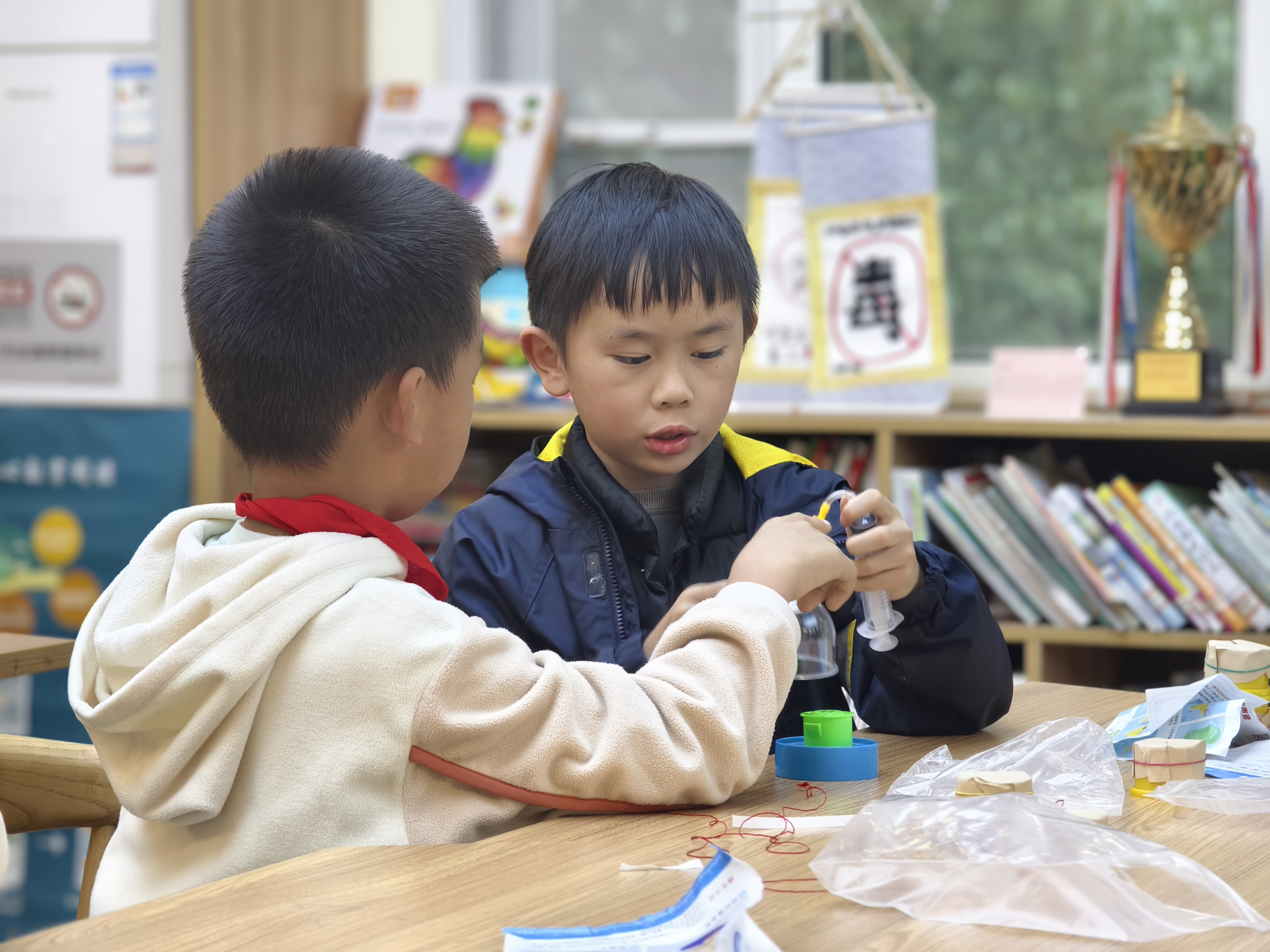 随后进行的“真空铃”实验中,孩子们两人一组,一人将正在播放音乐的玩具置于密闭的玻璃罩内并固定好装置的位置,另一人手拉针筒活塞将罩内空气吸出,随着罩内空气减少,音乐声也随之明显减弱。这一现象让孩子们清晰地认识到“声音的的传播需要介质,真空中无法传声”。