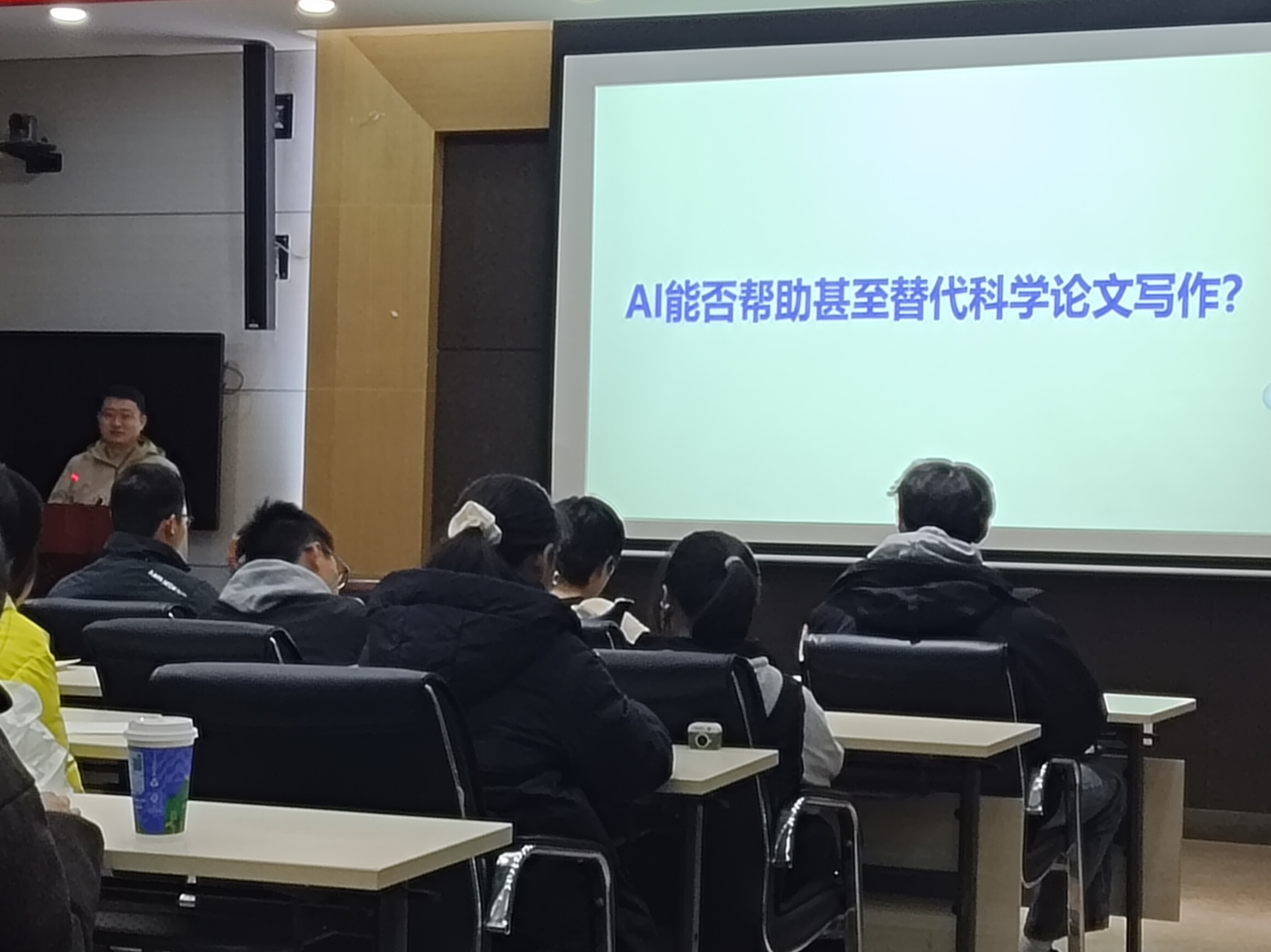 首先,寇宗魁老师以“AI是否能够助力乃至替代科学论文写作?”这一问题引发学生思考。他结合学生日常学习和科研中常用的AI工具,立足实际应用场景,深入分析了人工智能在辅助学习与提升科研效率方面的显著优势。同时,他也明确指出过度依赖AI可能导致思维僵化、内容缺乏原创性等潜在风险,引导学生树立“工具为我所用,而非被工具所束缚”的科学使用观念。