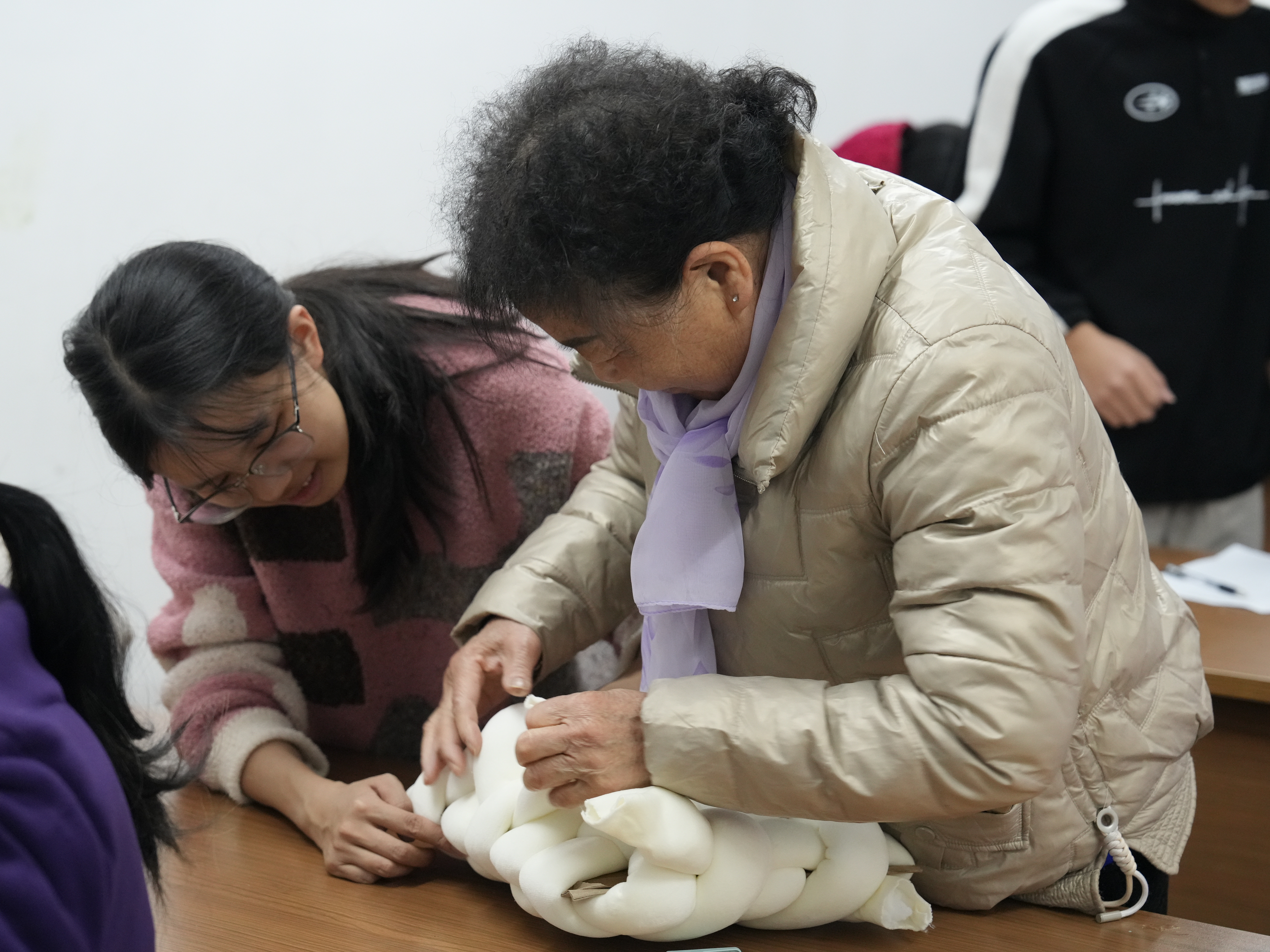 活动现场,暖煦服务队队长韩帅带领志愿者们提前备好编织材料,将活动室布置妥当;随后引导老人们有序入场,并进行编织示范教学。志愿者们坐在老人身旁,带着他们把毛线绕在硬纸板上,细致地讲解线圈如何交错、打结与衔接。老人们跟着一步步操作,指尖翻飞间,蓬松线团渐渐编出麻花状的纹路,最终变成胖乎乎的乳白色抱枕。