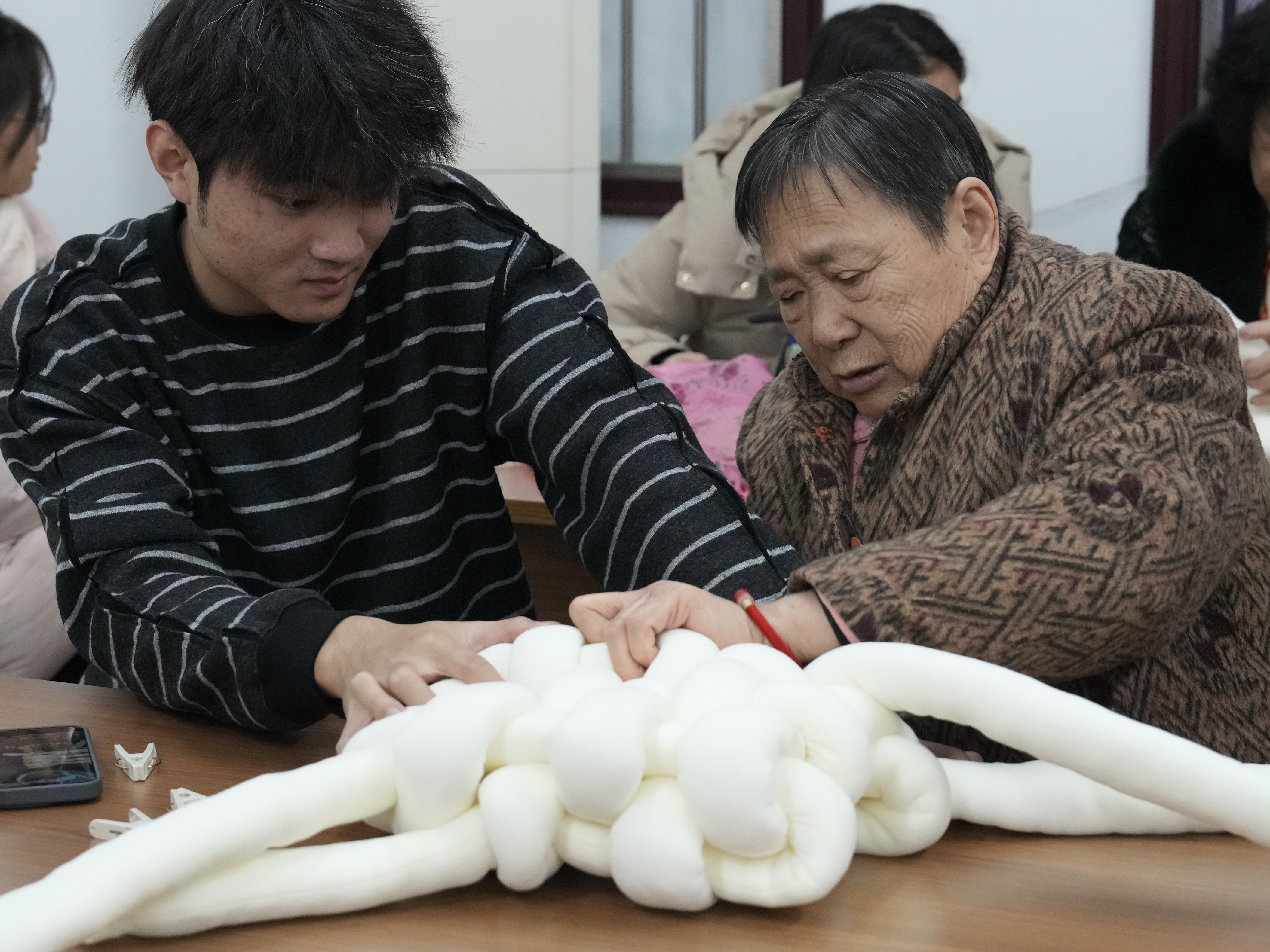 12月4日下午,暖煦助老服务队走进南湖新城社区开展社区助老志愿服务活动,他们与老人们一起用粗毛线编织抱枕,为社区老人送去陪伴与欢乐。