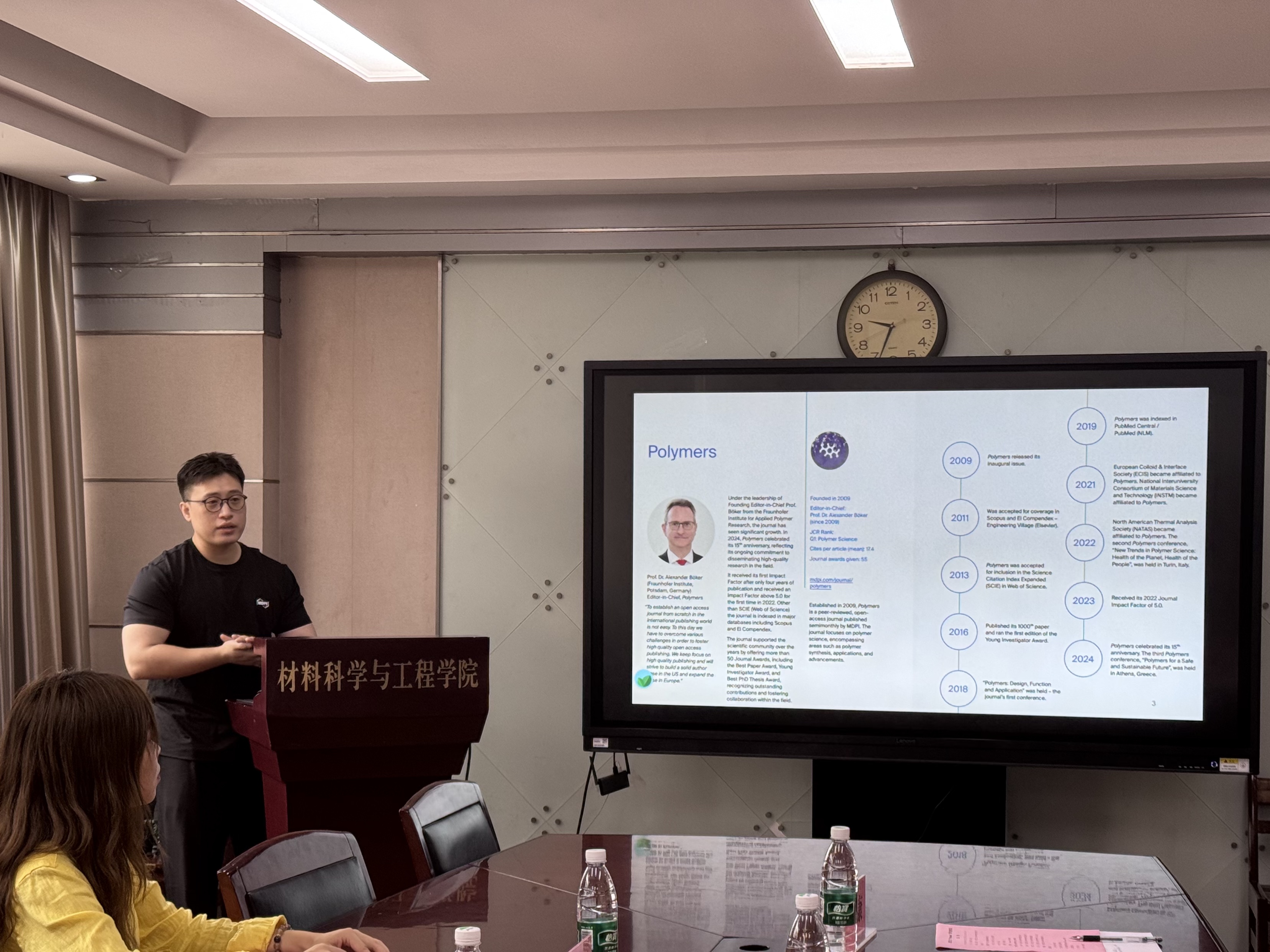 期刊责任编辑贾继康向与会人员详细介绍了《Polymers》期刊在高分子科学领域的国际影响力和未来发展方向。
