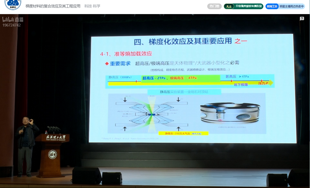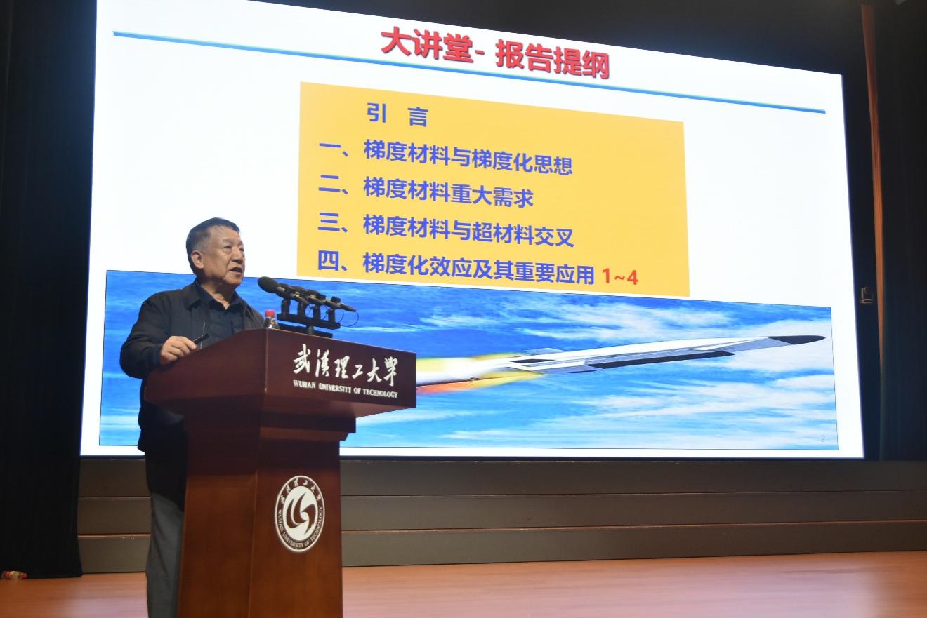 课堂伊始,张联盟院士从人类文明与工业革命史的角度,阐明了材料的重要性。他从单一材料的局限性切入,深入讲解了材料复合化及其结构与功能一体化的原理。随后,他围绕先进材料对高性能与多功能的需求,介绍了梯度效应与超构效应,并通过对竹子结构的剖析和越王勾践剑千年不朽原因的解读,使抽象概念变得生动具体。最后,他立足国家重大战略需求,从概念化与理论化的高度,介绍了梯度材料与超材料的交叉研究方向,并拓展讲解了其在航天国防及日常生活中的广泛应用。张联盟院士的讲解严谨专业而又深入浅出,不时穿插的幽默话语引得现场掌声阵阵,让同学们在轻松的氛围中深化了对梯度材料的理解。
