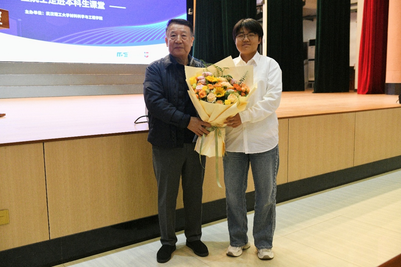 课堂最后,材科珠峰2501孙浩岩同学代表2025届材料全体新生向张联盟院士献花,表达了对张院士的崇高敬意。在同学们热烈的掌声中,“大师讲材料”暨院士走进本科生课堂第二课活动落下帷幕。