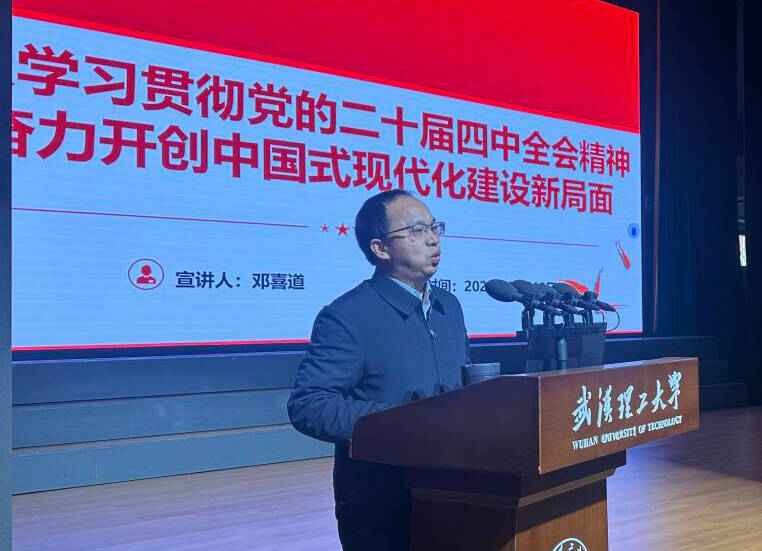 为深入学习领会党的二十届四中全会精神,引导广大师生准确把握其核心要义与时代价值,12月18日,565net必赢特邀学校宣讲团成员、马克思主义学院邓喜道教授,为全院党员师生作题为《深入学习贯彻党的二十届四中全会精神,奋力开创中国式现代化建设新局面》的专题辅导报告。报告会由学院党委副书记兼副院长金琴主持。